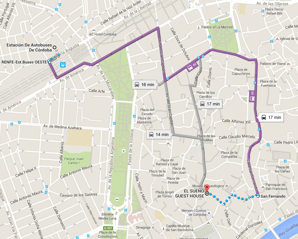 If you are going to arrive to Córdoba by train or bus and then you want to take a bus to arrive to the hostel, both station are in the same street, easy!